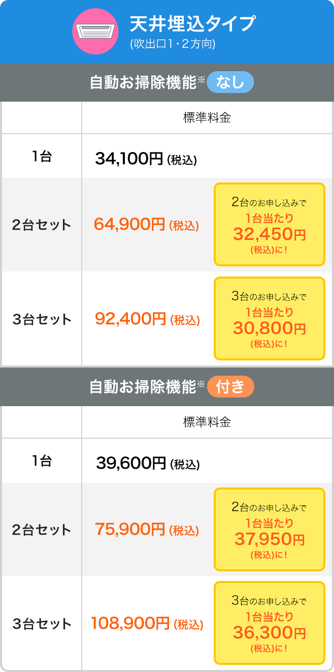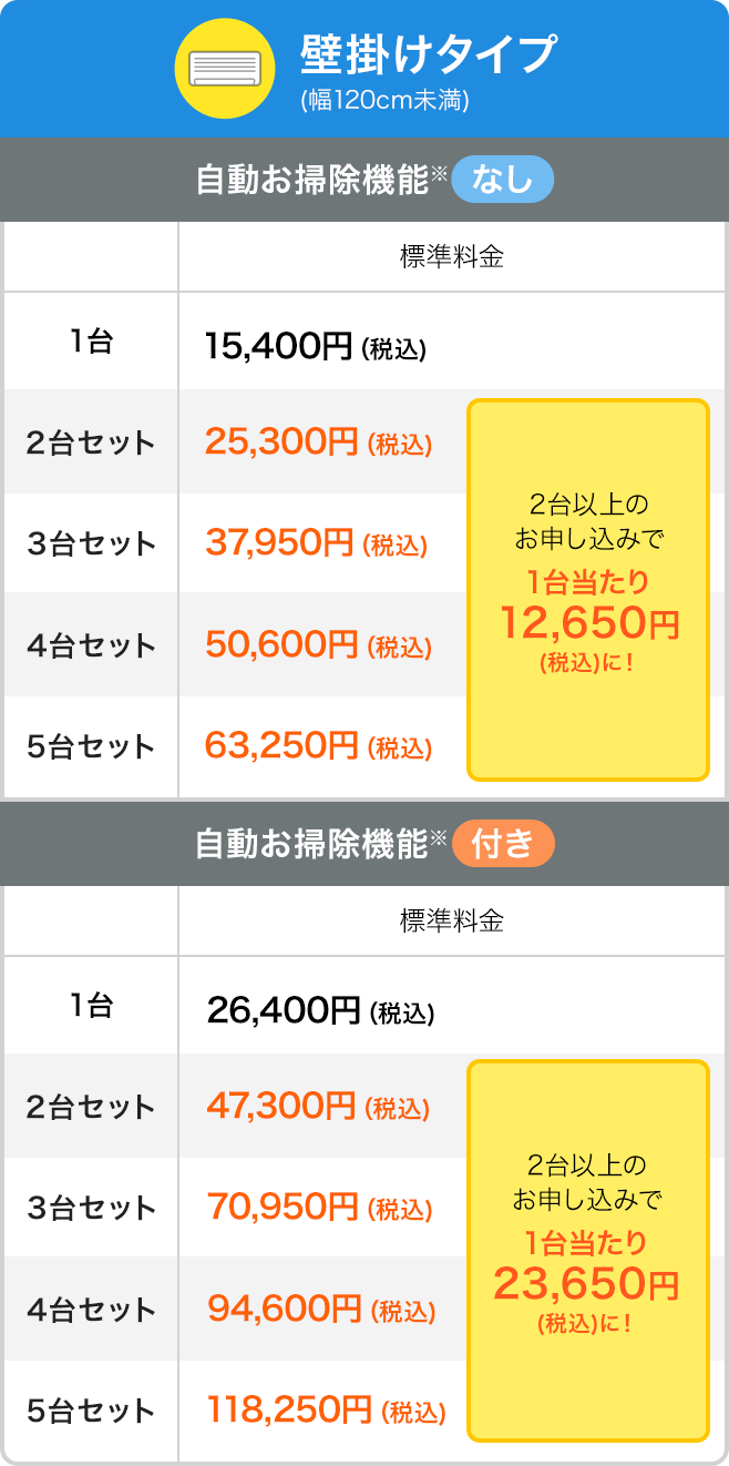 作業時間はどれくらいですか?所要目安時間として、お掃除機能の無いエアコンの場合は、1台あたり約1時間半となります。お掃除機能付のエアコンの場合は、1台あたり2時間半~3時間となります。